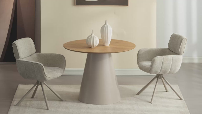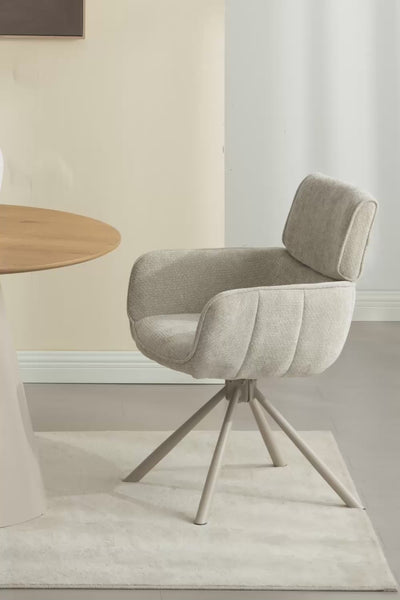 La rotazione a 360° di Elara permette di raggiungere il sale o brindare ai bei momenti senza alzarsi dal proprio posto. Lo schienale leggermente curvo e i braccioli integrati avvolgono in comfort, mentre le cuciture verticali precise aggiungono un tocco di design. Si integrano perfettamente in un set da pranzo con tavolo e 4 sedie o si distinguono come una coppia elegante in un angolo lettura.