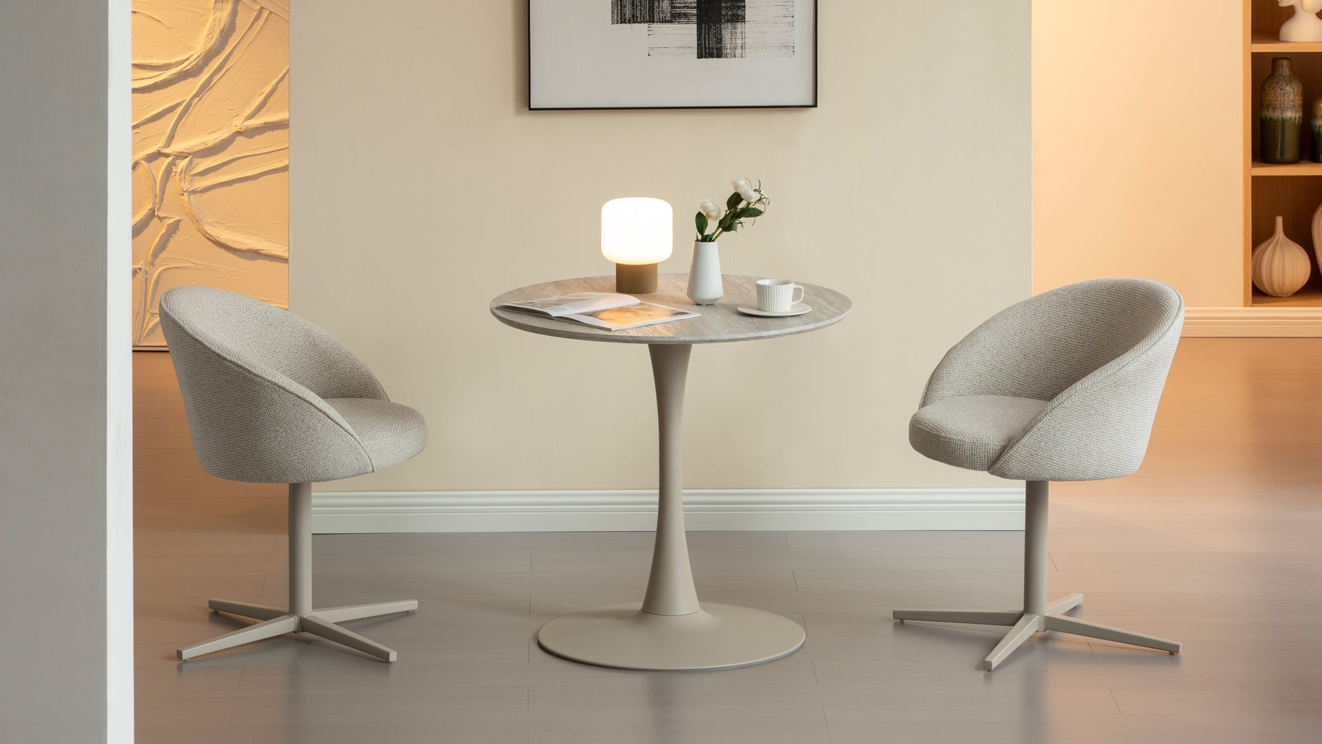 Le sedie sono rivestite in lino e ruotano a 360 gradi, aggiungendo un tocco di modernità all'insieme. I cuscini spessi e i braccioli dalle linee pulite combinano comfort ed estetica, rendendole la scelta ideale per una cena romantica o un semplice pasto in coppia.