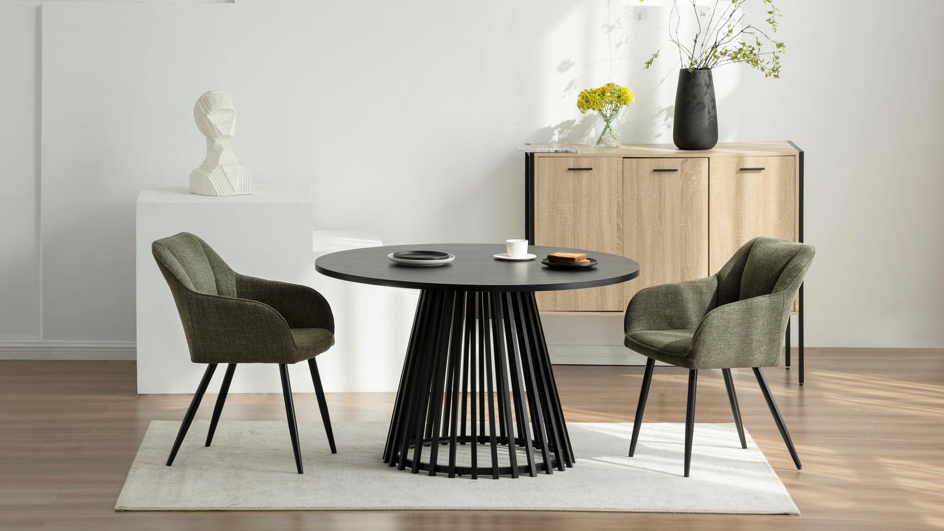 Questo tavolo da pranzo rotondo Veronica nero (120 cm di diametro) e le quattro sedie Sienna in tessuto di lino sono perfetti per aggiungere un tocco di eleganza moderna alla vostra sala da pranzo. Il tavolo rotondo di 120 cm di diametro è realizzato in MDF con una finitura in legno venato che gli conferisce un aspetto rustico e naturale. Questa finitura imita l'aspetto del vero legno ed è disponibile in nero, conferendogli la durata dell'MDF e un tocco di design unico.