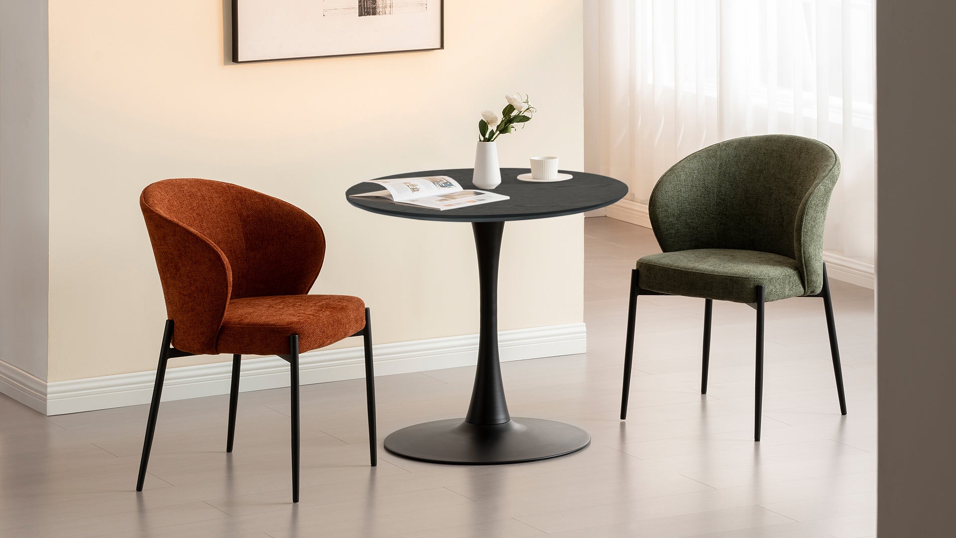 - 【Design elegante】Il piano del tavolo e la base sono arrotondati con linee lisce e naturali, gambe sottili in metallo nero e beige con piano del tavolo impiallacciato in carta di travertino, il design complessivo aggiunge un tocco di raffinatezza ed eleganza alla zona pranzo ed è adatto a una varietà di stili di arredamento della casa.